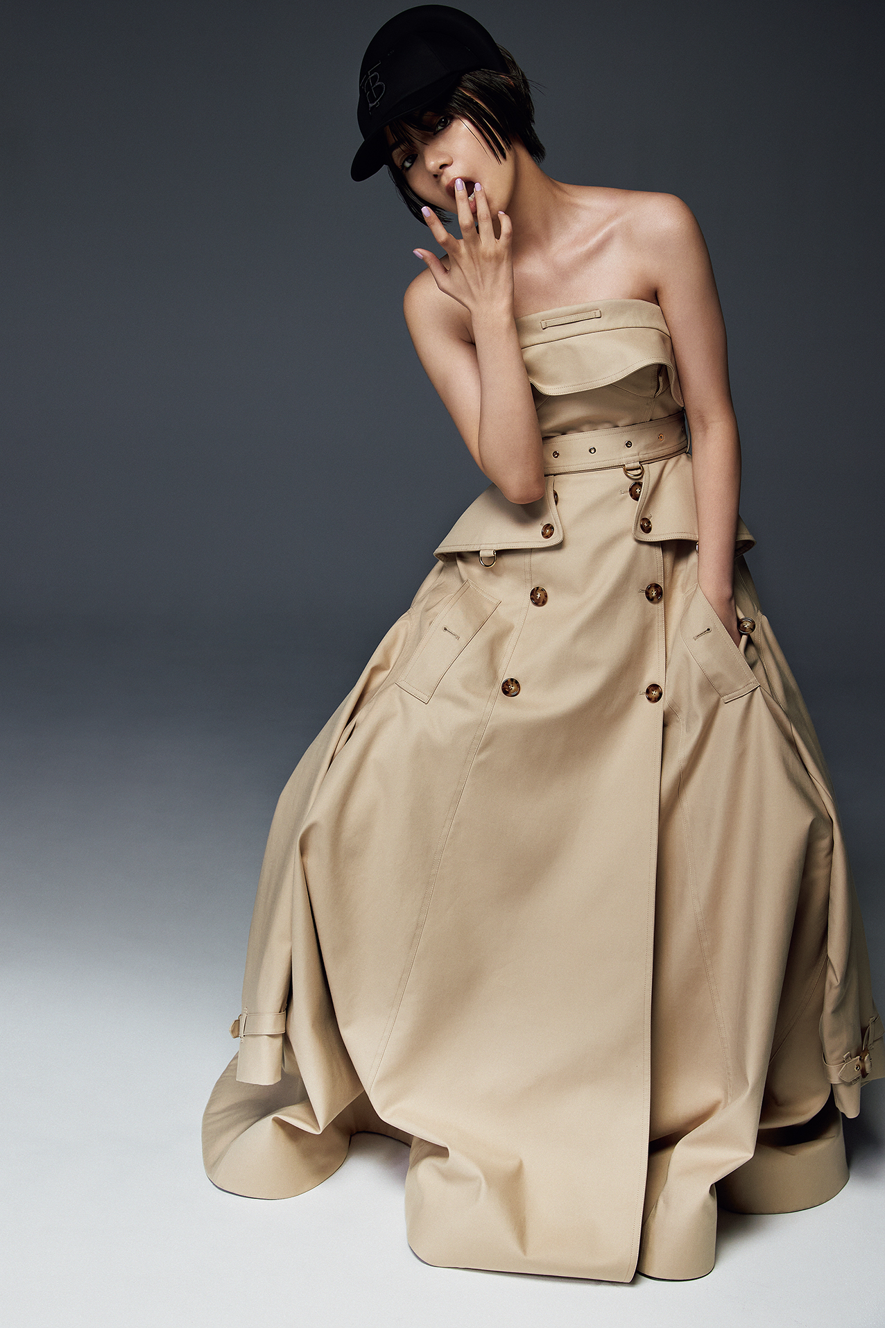 ランウェイの注目を一身に集めたベアトップドレスは、トレンチコートを再構築したかのような遊び心あふれるデザイン。ドレッシーなヘッドバンドとスポーティなベースボールキャップを合体させた帽子も含め、伝統にツイストを加えたバーバリーらしい盛装の提案だ。ドレス¥3,630,000、帽子¥81,400(すべて予定価格)/ともにバーバリー (バーバリー・ジャパン)
